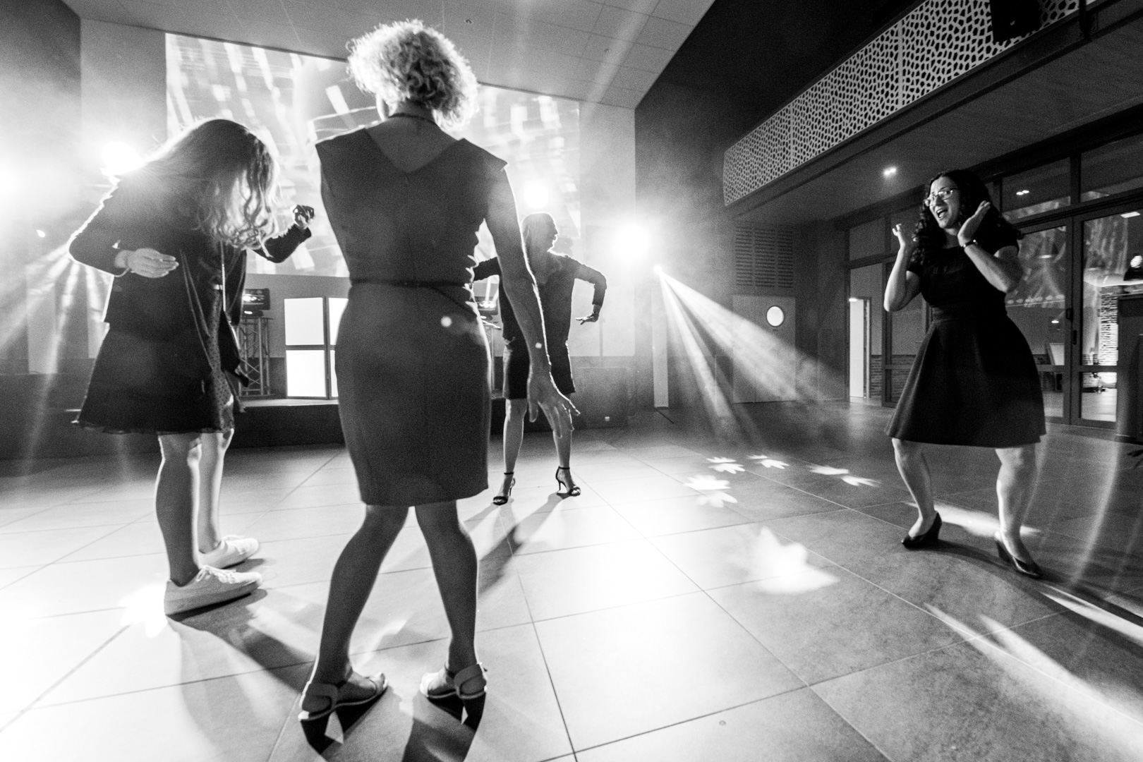 La soirée se termine, les derniers danseurs se déhanchent encore au rythme de la musique. Leurs silhouettes découpées par les contres-jours créés par mes flashs, je me régale encore un peu avant de terminer ce mariage avec Johanna, ses sœurs, son frère, ses amis proches.